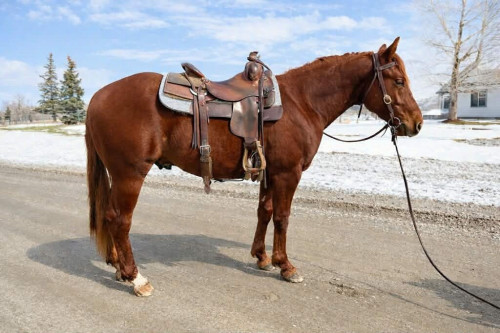 Big-boned, sharp-made stud colt with a great look and solid start. Will have 90 days in a cowhorse program by sale day. Gentle, easy-going, and willing. Rides around relaxed, started on the flag, been ridden outside, and has had a rope swung on him. Handles everything quietly. Set up to go on in cowhorse or make a solid rope horse. Paid into the Riata Buckle for 2026 and enrolled in the NRCHA Cowhorse Incentive.