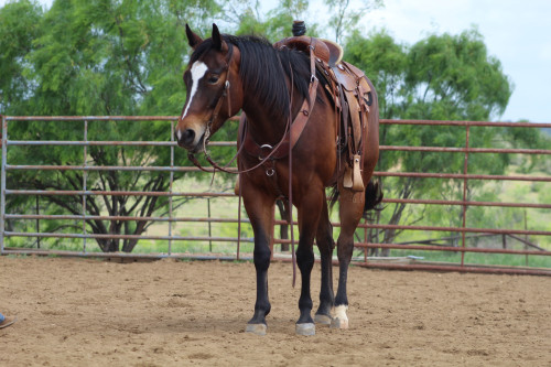Selah, a 7 year old 15.2 bay mare with a solid foundation and a big future ahead. She has an awesome working cow horse pedigree and ready to work. She was started as a 2 year old, then turned out to mature and brought back to training at 6 years old. She is currently tracking calves and will continue her breakaway training till sold but is big enough to make a jam up head horse.