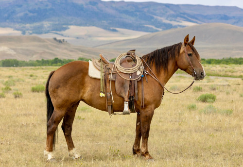 Fruit Snacks is a home raised 7-year-old Brabrant quarter horse cross mare. Several years ago, I purchased, started then ranched on her dam. Eventually, she moved to the brood mare band. The Brabant stallion we crossed her on sired foals showing good minds and athletic ability. Fruity surpassed our hopes from the start. She’s extremely consistent and quiet minded, while still having a desire to travel. She’s a fast walking and long trotting horse that can really eat some country. Gentle on the ground and under saddle, plus easy to shoe and catch- her name speaks to her love of snacks! Best of all she takes time off extremely well. She’s pulled her weight on doctoring many cattle for me in steep mountain country. She runs hard to cattle, while keeping a steady sure foot in the rough terrain. Leading pack strings, branding, and halter breaking colts are other jobs she’s handled for me. Fruit Snacks is the most pleasant mare on our place and continually receives compliments for her looks. This mare is one of our favorites, and we are proud to offer her this year. For more information, call Jace @ (307) 350-0308.