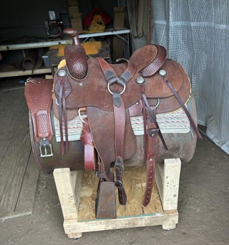 Handmade roping saddle. 15 1/2” seat on a Hadlock & Fox Modified Association tree. Rawhide covered, 7/8 rigging, 6 1/2” gullet, 12-14 rough-out leather with basket weave. Matching rear cinch and breast collar.