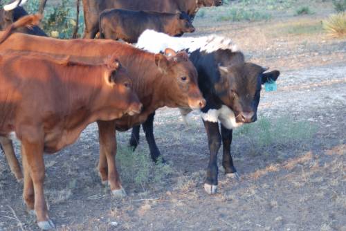 5 corriente steers or 5 corriente heifers, all blacks, browns, or reds except for one spotted steer. Steers have horn from 1/2 ear to full ear. Heifers have horn from 1/2 to 3/4 ear. They are 6 to 8 months old.