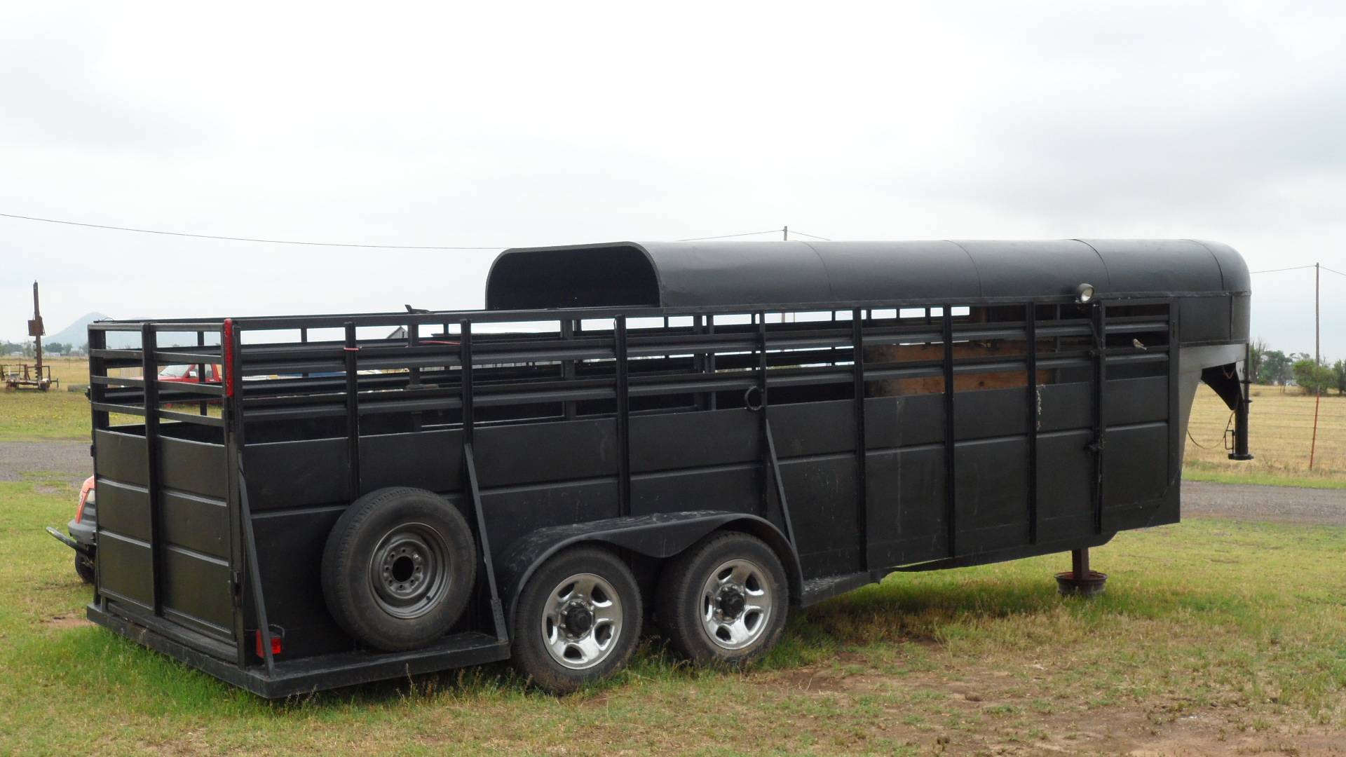 18 ft. livestock portion/ 4 ft. tack room, rumbar floor, chrome wheels and good tires, trailer is low clearance on back, easy step up for cattle or horses, divider gate, new clearance lights, tack room light, curb side light, half top.