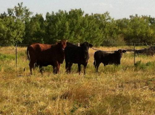 Blacks and reds, crossbred cows, 3-5 yr olds with 200-300weight calves at side. All cows and calves have been worked, wormed, vaccinated, ear tagged, insecticide tagged and are gentle. Minimum cut is 25 pairs. Mobile number is 210 827 4811 and text is better - Ill call you back. The older cows in pictures are not included. You can pick from about 45 pairs. Cattle will come to horn, cake broke and been worked horseback. Will be easy to get 25 young good pairs from this bunch.