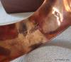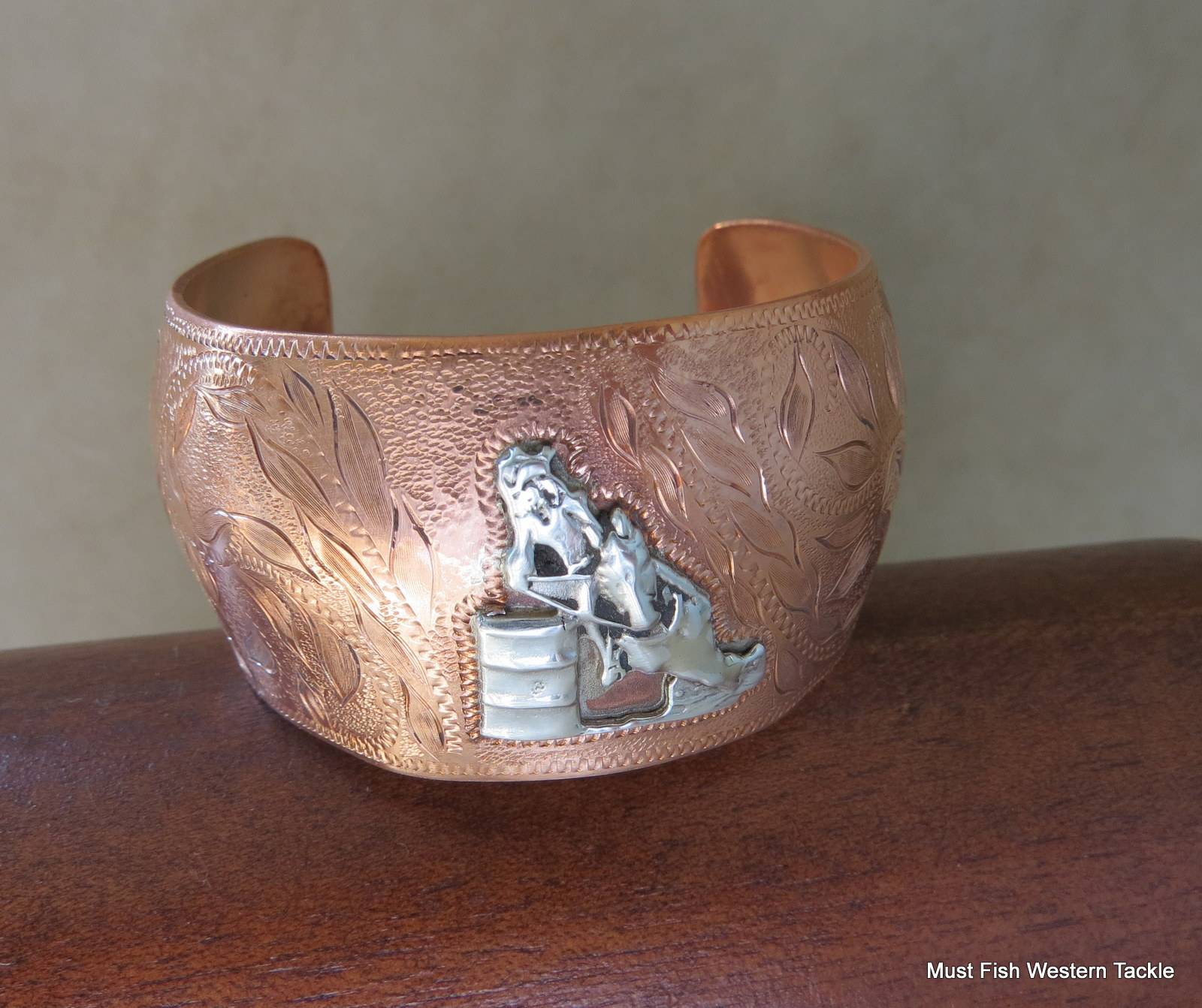 This is a new engraved copper bracelet mounted with a sterling silver barrel racer made by Stephen White from Plainview, Texas. It is marked S White. Stephen started making spurs and cowboy hardware in 2004 and attended the Weyerts School of Engraving in Alpine, Texas to learn various techniques for overlay and inlaid engraving. Stephen is one of the spur makers selected to provide spurs for the Texas Style Bit and Spur Makers Association Woman’s Protective Services auction along with other top makers. This would be a nice bracelet to wear.