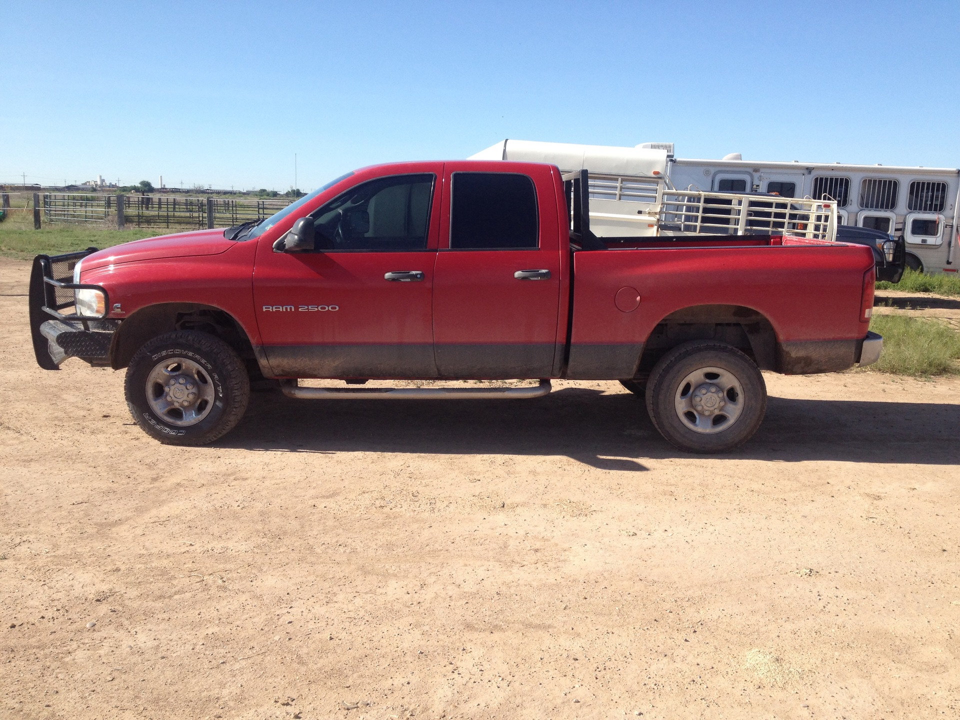 This is a really nice pickup with the good 5.9 Diesel engine with low miles and manual 6 speed transmission. It has 114,xxx miles. It is a 4 door, short bed, 4x4, with a gosseneck ball. It has running boards, grill guard bumper combination, and headache rack. Exterior is red with a black rhino lining on the bottom. It has brand new tires on the front and 50% on the back. The interior is black with cloth seats, CD player, power seat driver side, cruise, tilt. It has two small creases on the top of the tailgate but everything else is in great shape and works. Located in Roswell NM. No trades.