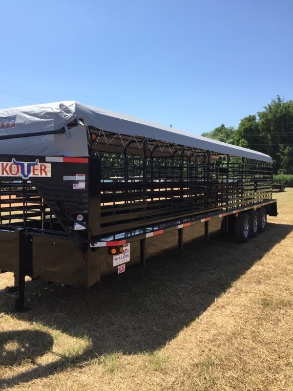 New 2015 Neckover 6.8 x 32 gooseneck stock trailer Has channel neck , full escape door , tubing sides, extra runners, rubber cleated floor, has 2 cut gates 12/12/8 butterfly rear gates ,3 -7000 pound torsion axles , spare tire , LED Lights, 3 inch rear bumper.