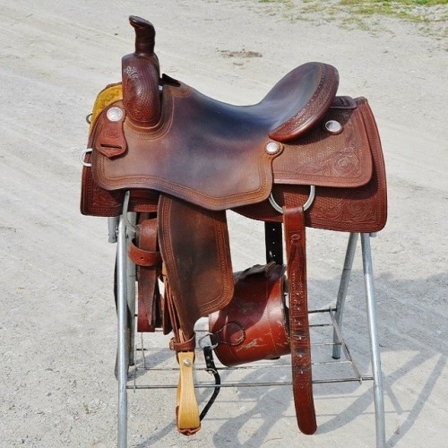 This good looking 15.5" Cactus Cowhorse is another trade-in on a new Don Rich Ranch Cutter. Floral and basket weave tooling, hardwood stirrups, 28" skirt length and 7" gullet width. I’ve ridden this saddle several days and it really sits and rides nice. Has a few ruffles from a rope on right swell and we recovered the horn with a new latigo wrap. Like so many Cactus and Martin saddles, this one seemed to be made for someone extremely long legged as I wear a 38" inseam and was in the top hole of adjustment. We shortened the fenders and the adjusting leathers and now I have it adjusted to fit me in the middle holes. Really nice close contact saddle and reasonably priced at $1450 delivered in the lower 48 states. Additional photos at our website www.westernhorseco.com