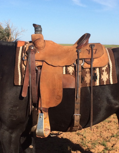 Handmade saddle by maker Ken Nelson. Saddle is a 2012 model built on an Arizona Roper tree and is in excellent condition. Leather and latigos are heavy and soft. Y7 and a cross brand are on the skirts. I have several other pictures. Please call if you are interested in this saddle.