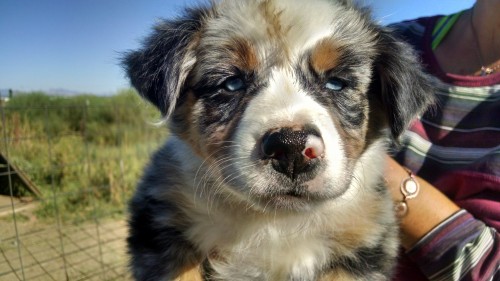 ASCA/AKC beautiful blue merle tri female. Cattle Working Dog parents. Raised with kids from 3 - 12. Lead around by 3 year old. Has had no issues being in crate overnight. Great family dog and shows great working dog potential. She was one of the first to start draggin on my pant legs. :) She was the heaviest and biggest pups in litter and just feels solid. Check out TrueWorkingDogs.com for more pictures and videos! Delivery for cost of fuel possible between Southern Arizona up to Phoenix towards Bakersfield CA. Also ground shipper available going through Texas. Again, see TrueWorkingDogs.com and click on the Aussie Pups by Frosty and Jake for more pictures, videos and check out Our Aussie Dogs for more information about parents.