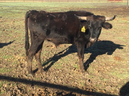 7 head of fresh bulldogging steers, 4 blacks, 1 red, 1 brindle, 1 brown paint