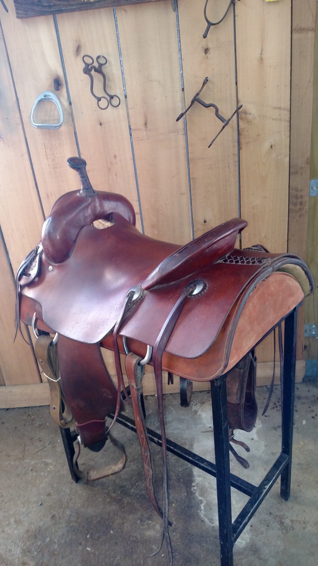 15.5 IN. SEAT, DOUBLE RIGGIN, STAINLESS CONCHOS AND STRINGS,GOOD AND SOLID