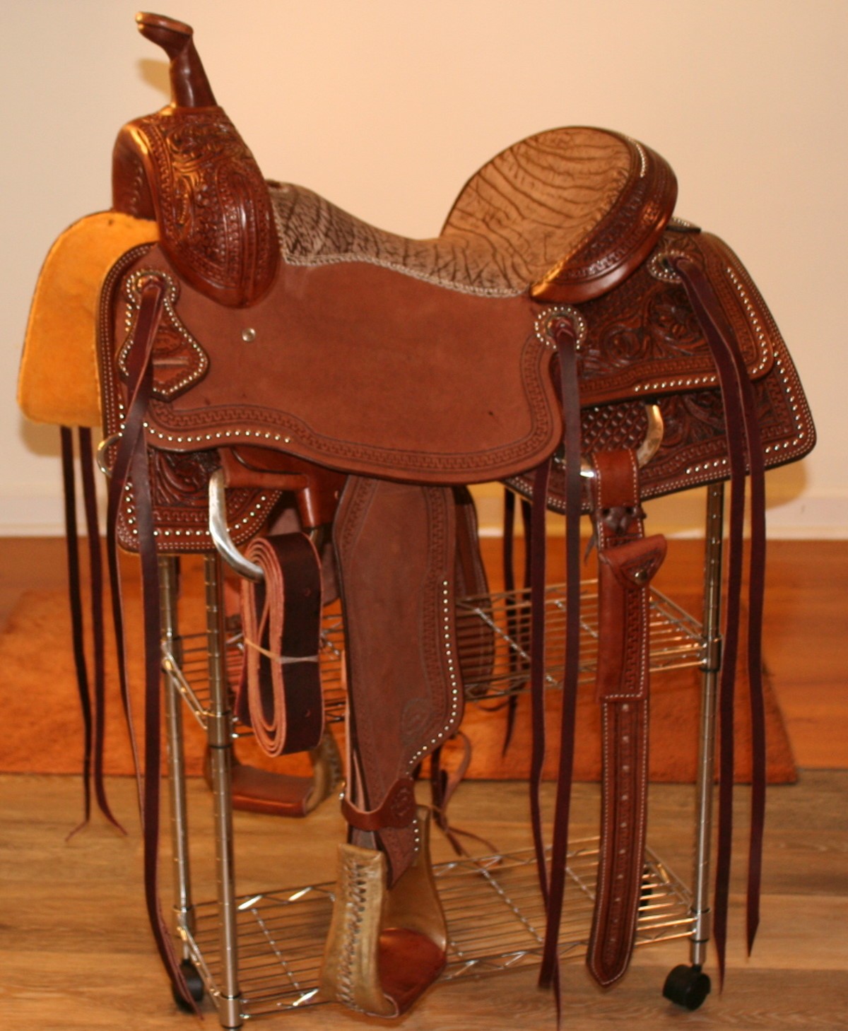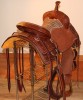 Free swinging fenders and the extra grip of the lightly sanded seat make this saddle the perfect choice for cutting, sorting reining or competitive mounted shooting. Tough enough for daily work but fancy enough for the show ring. Weighs 40 lbs as pictured. Free Shipping within the Lower 48 States. Please call.