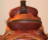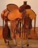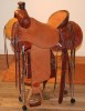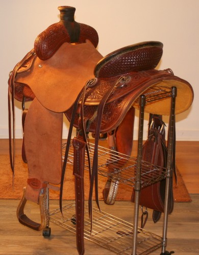 Will James Ranch Saddle, 16" Seat, 7 1/4" Gullet, Full Quarter Horse Bars. Hermann Oak Hand Tooled Leather Skirt with Rough Out Seat, Jockey and Fenders. High back cantle with rawhide trim. Rawhide Covered and Laced Oxbow Stirrups. Tooled Leather Back Cinch included. Weighs 38 lbs as pictured. Free Shipping within the Lower 48 States. Phone calls only please.