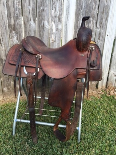 Jeff Smith Ranch Cutter. 16 in seat. In good working condition. Solid saddle and tree. Nettles stirrups. Missing the button on the hoof pick holder, but everything else is great.