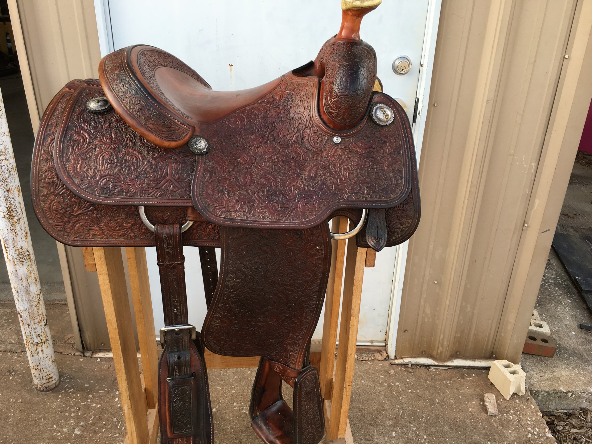 Sale pending^^^^^^^Custom, saddle made by Trophy Tack at Bixby, Ok. They made saddles for many of the PRCA ropers, the working cowboy, reiners, western pleasure riders, and on and on. Quality plus in thier workmanship. This saddle is fully tooled, with 15 1/4" seat. The 4 dee rings and the 2 back cinch buckles were made by and marked by noted bit and spur maker Billy Klapper. There is a subtle brand tooled in the rear housing and owners initials on front conchos only. The leather has been well cared for. The saddle is maker marked and is a 100% Trophy Tack. It is in very good condition, pliable. Irreplacable saddle. We accept Pay pal, most credit cards, money order, check. We will pay shipping within the 48 states.