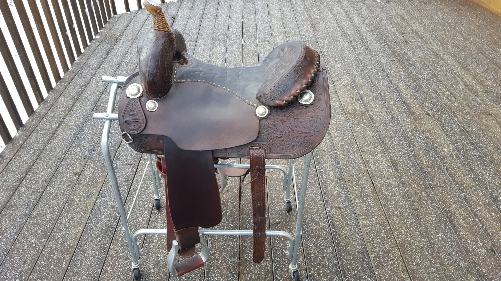 Bob Marshall custom cutting saddle with acorn leaf tooling, padded seat and sterling silver conchos. Very comfortable to ride. New fenders, aluminum stirrups.