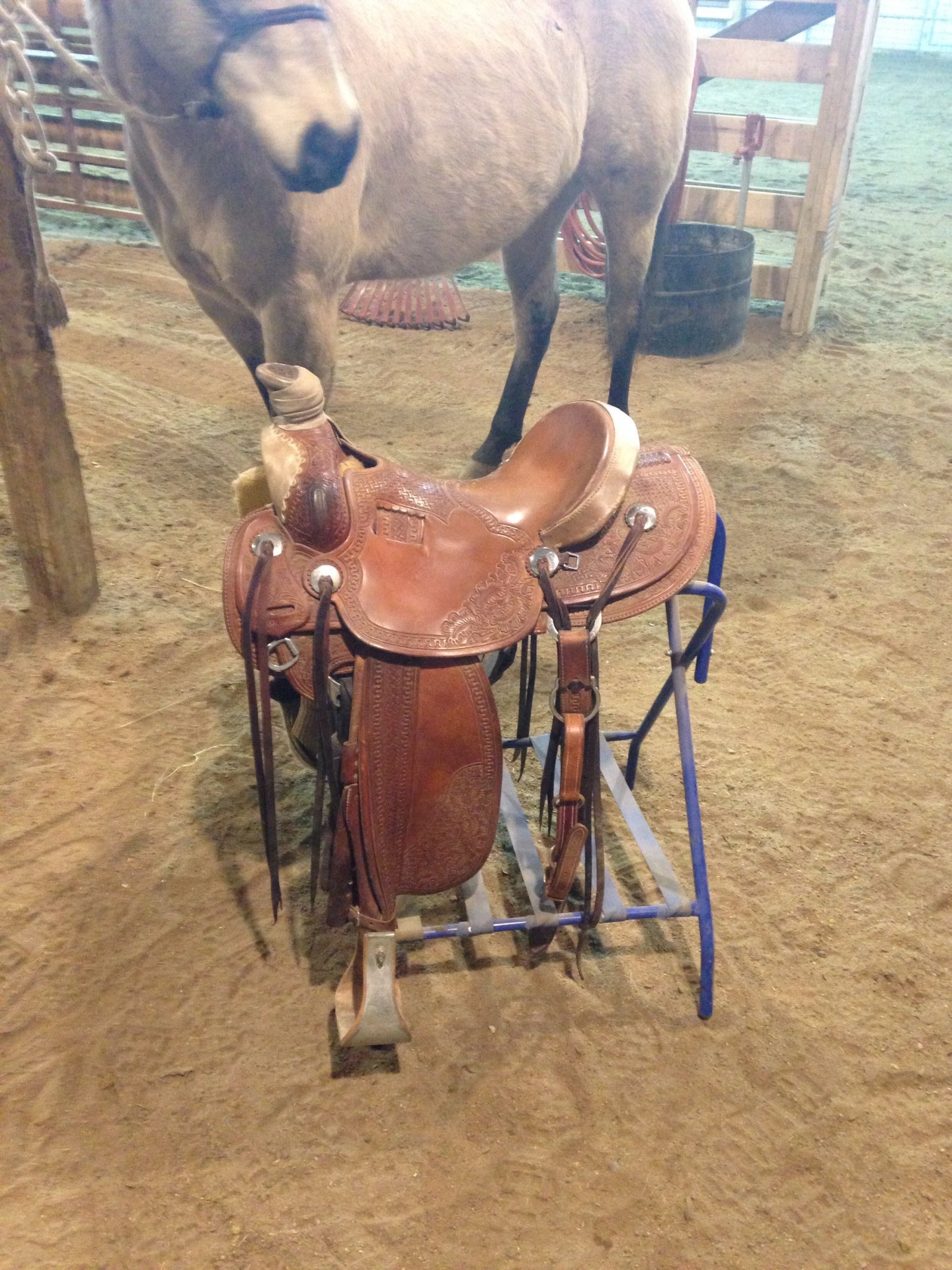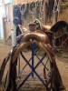 This is a gently used McCall Modified Association saddle for sale. 16" tree finishes at 15 3/4" seat. FQH bars. 7/8 Flat Plate rigging, # 4 dally horn, 3 1/2 " Cheyenne roll cantle, 3/4 loop seat, outside stirrup leathers. Rawhide on the fork as well as the horn cap, and cantle binding. Crazy leg stamping with Carlos boarder tooling, Ence oak and acorns at the corners. Four inch wooden Nettles bell stirrups( not pictured) . Matching crazy legged stamped/ Carlos border saddle bags. Matching breast collar. This was a custom saddle I ordered two years ago and have used lightly over that time, it’s in great shape! Fits a variety or horses very well. The saddle was hand built from McCall’s designer series saddles and is a great using rig with some eye appeal. Lots of compliments on this one. Call, text, or email dereklehrke@hotmail.com