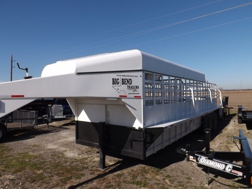 This white,24’ Big Bend includes the following options: 14,000 lbs. GVWR, 2 - 7,000 lb. Dexter axles, cleated rubber floor, bulldog heavy duty coupler, spring-loaded center jack, 16" x 8 hole wheels, 10 ply tires, all LED lights, rear butterfly door / side standard escape door, 3/4 metal roof, aerodynamic nose cap, 2 - heavy duty slam-latch center gates, rear roller pin, and three 8’ compartments .