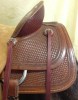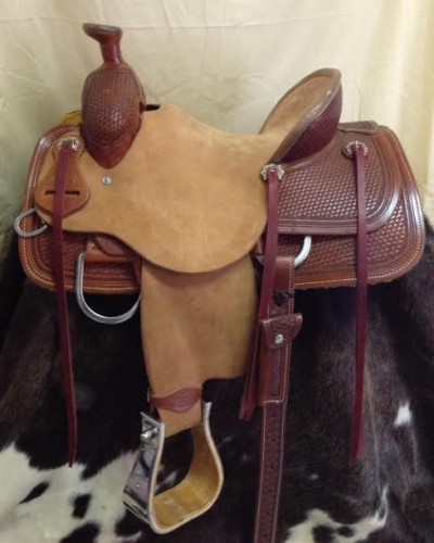 Youth Ranch/Roping Saddle $1125 Half tooled, rough out/basket stamp/rope border, QH bars, hard seat, 4" straight cantle, close contact skirts, heavy S/S hardware, six strings, leather latigo, billet, and back cinch, built on a rawhide covered hardwood TM Ranch tree. $1125