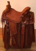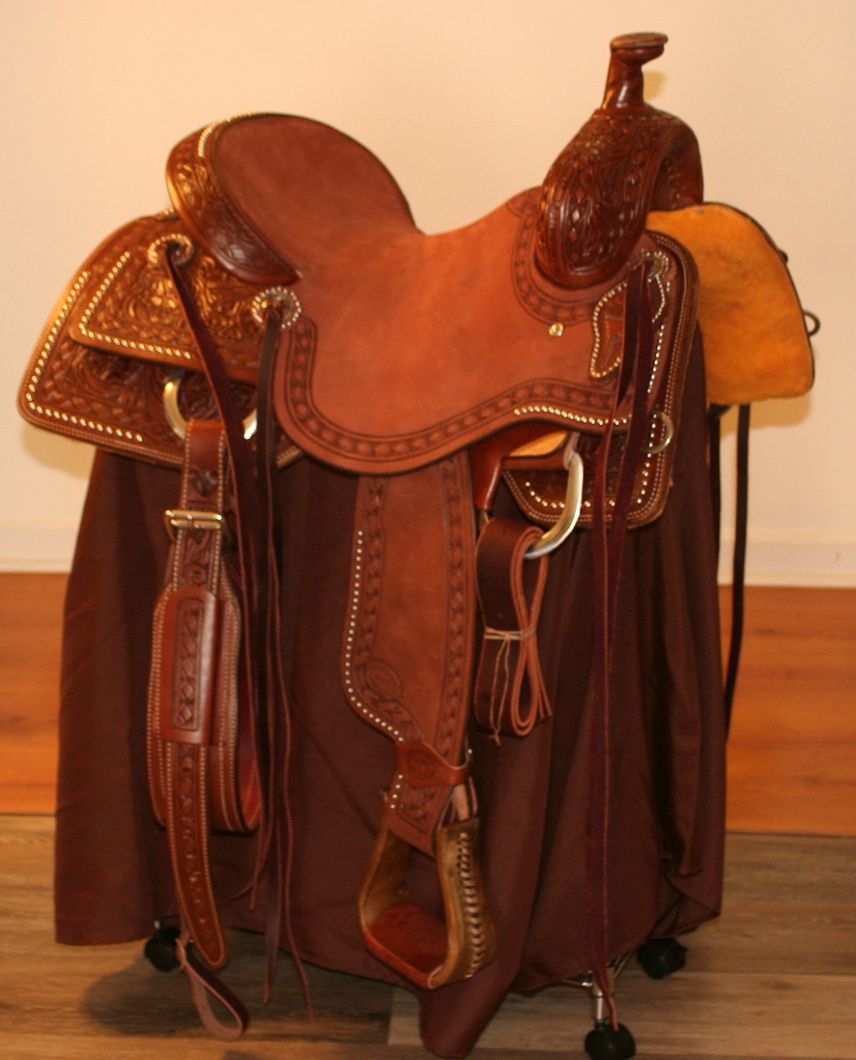 15.5" Cutting Saddle by Jay’s Custom. Full Quarter Horse Bars. Hermann Oak leather with lightly sanded seat, jockey and fenders. Jeremiah Watt conchos. Low profile horn and free swinging fenders. Close contact skirt measures 27" front to back. Weighs 40 lbs as pictured. Free Shipping within the Lower 48 States. 615..849.6022 Calls Preferred.