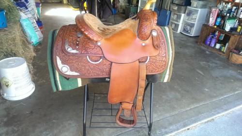 15" Cleburne darryl slinkard reining saddle rare find in this size.Tooling.silver super nice saddle light oil..shipping $75