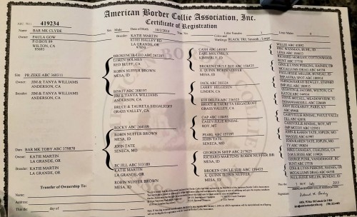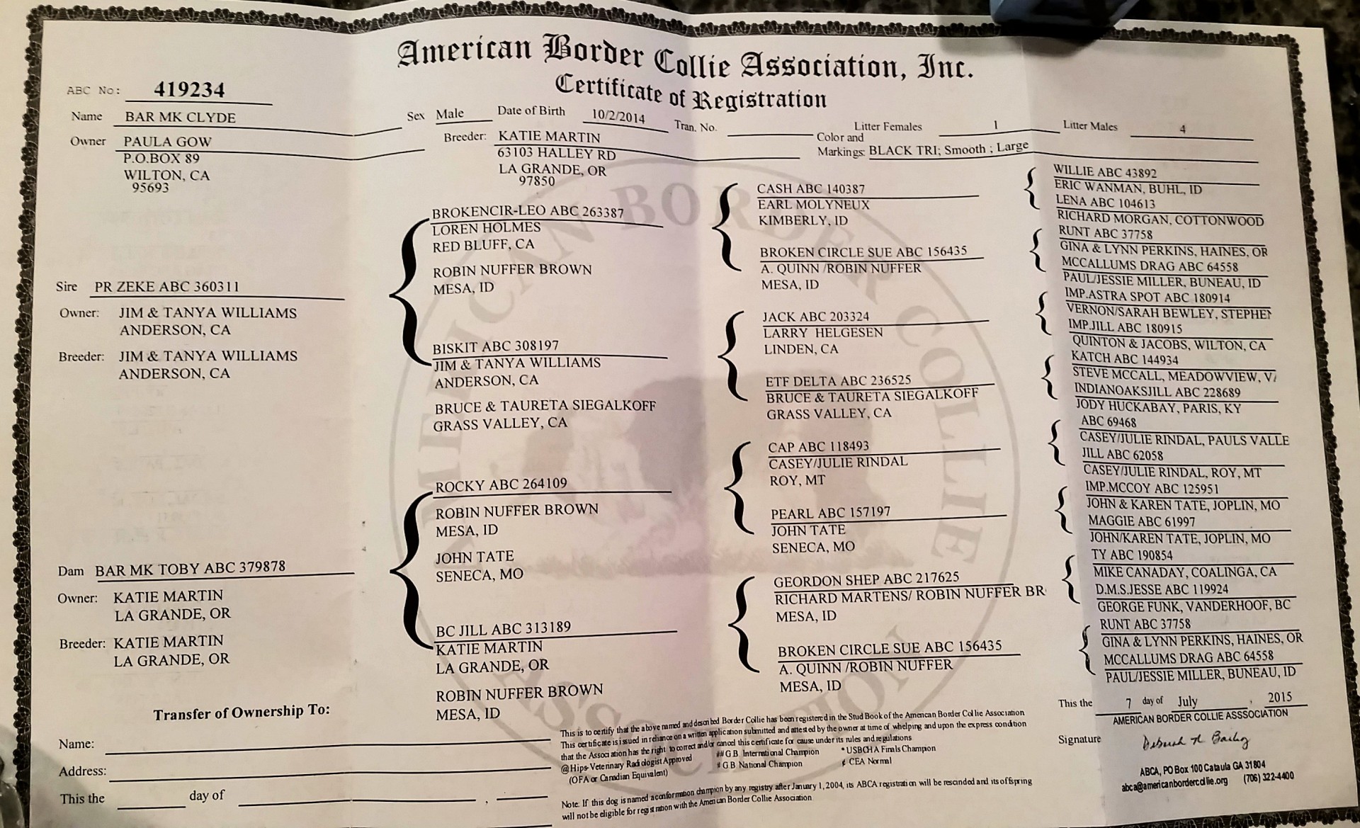 Bar MK Clyde. PR Zeke/Bar MK Toby. Clyde is a strong, well started dog. He bites both ends but has a ton of presence and doesn’t need to bite often. He has a very good foundation and is ready to move to real ranch work. He has a strong drive and eager to work as well as a desire to please. He is easy to be around when he is just hanging out around the house/barn. He is UTD on shots and is microchipped.Well started male Border Collie. Tri colored smooth coat. Whelped 10/03/14.