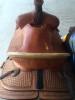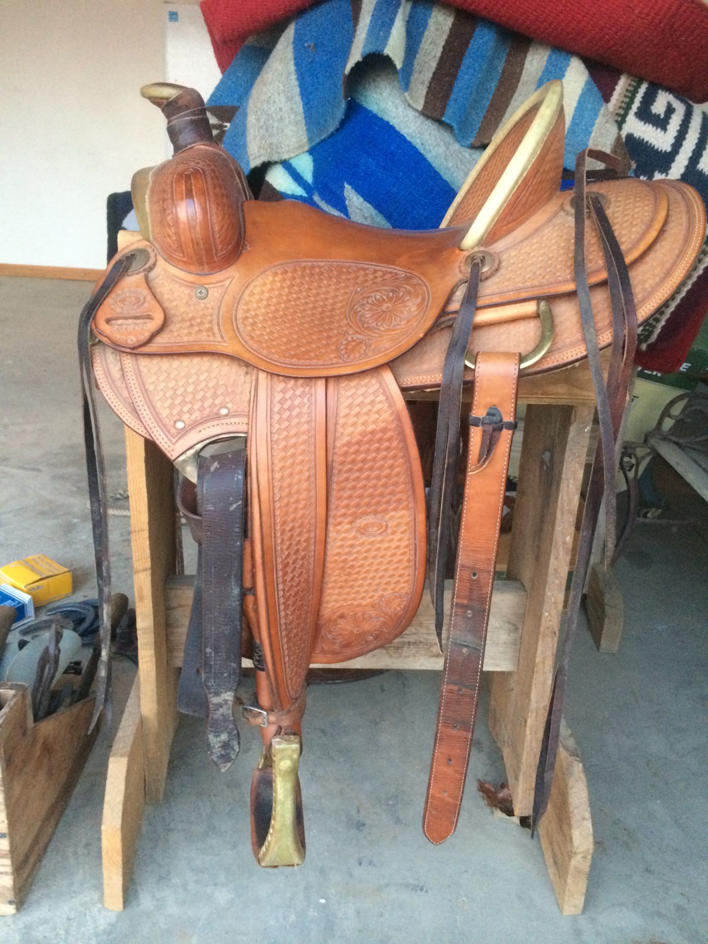 15 inch ,round skirts, outside stirrup leathers,basket and floral combo. This saddle has been ridden very little. Very comfortable riding saddle!