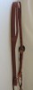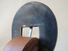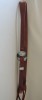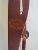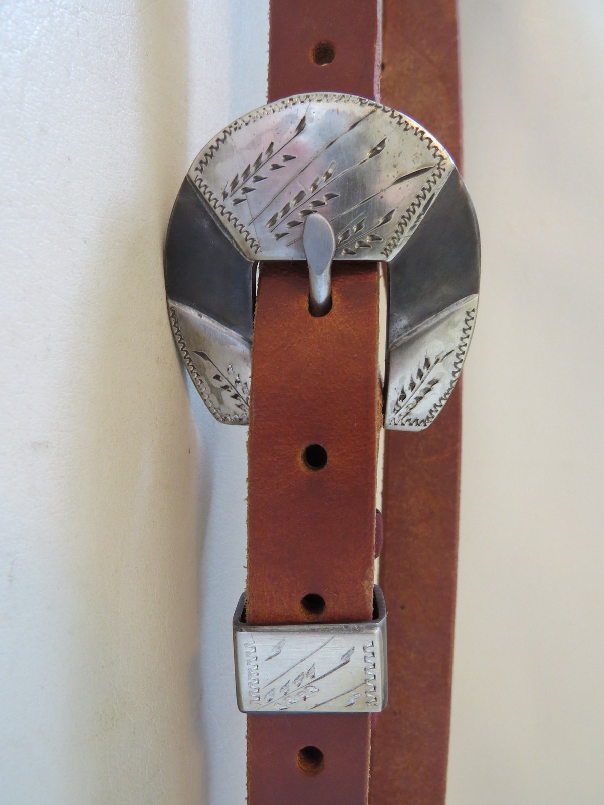 New handmade dark heavy harness leather shaped ¾” slot ear headstall with a handmade buckle made by Robert Evans. Robert is a long time bit and spur maker originally from Amarillo, Texas. The back of the buckle is marked Evans. It is steel mounted with engraved nickel silver. The buckle is attached to the headstall with latigo lace leather. The headstall is made out of really nice quality dark heavy harness leather. The edges are beveled and hand rubbed. It has straight bit ends and the bit attaches with latigo tie strings. It was made by Grumpy Old Cowboy from Happy, Texas. He has been building cowboy gear since the 1970’s and does a really nice job. It is maker marked with his stamp.