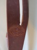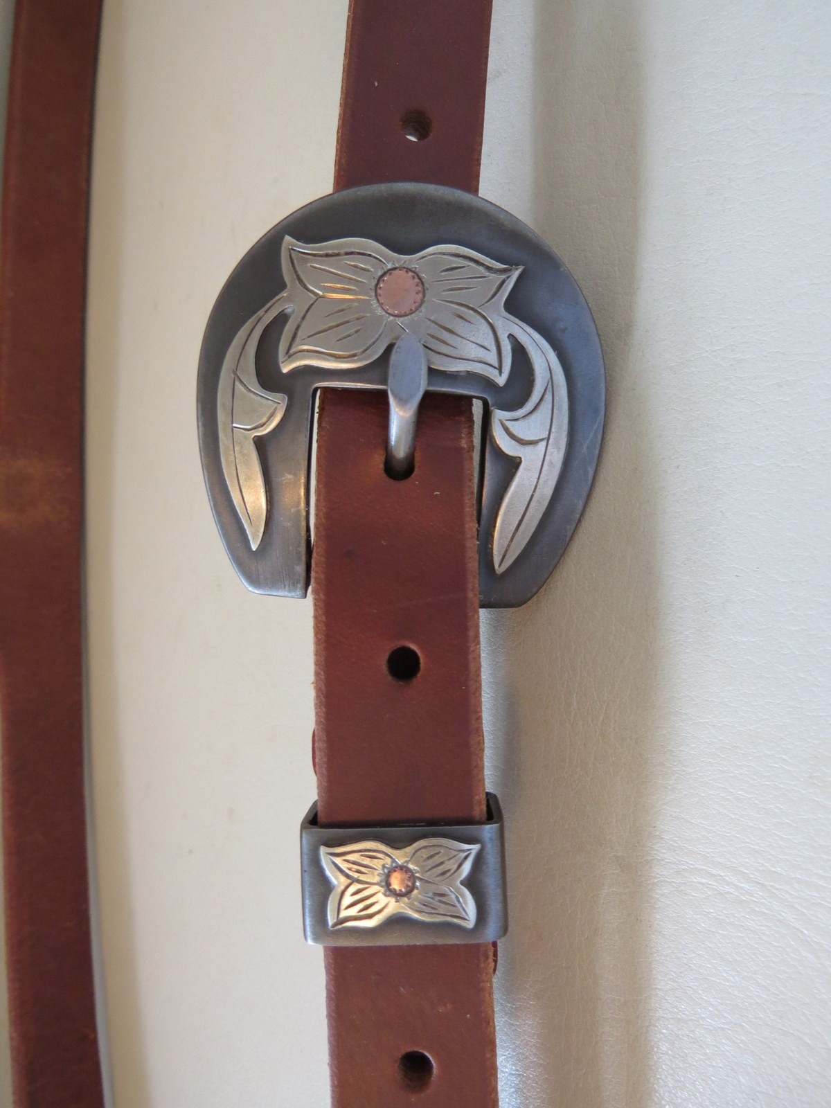 New handmade dark heavy harness leather shaped ¾” slot ear headstall with a handmade buckle made by Robert Evans. Robert is a long time bit and spur maker originally from Amarillo, Texas. The back of the buckle is marked Evans. It is steel mounted with engraved nickel silver with a copper dot in the center of the flowers. The copper is set flush with the nickel silver. The buckle is attached to the headstall with latigo lace leather. The headstall is made out of really nice quality dark heavy harness leather. The edges are beveled and hand rubbed. It has straight bit ends and the bit attaches with latigo tie strings. It was made by Grumpy Old Cowboy from Happy, Texas. He has been building cowboy gear since the 1970’s and does a really nice job. It is maker marked with his stamp.