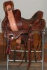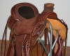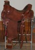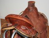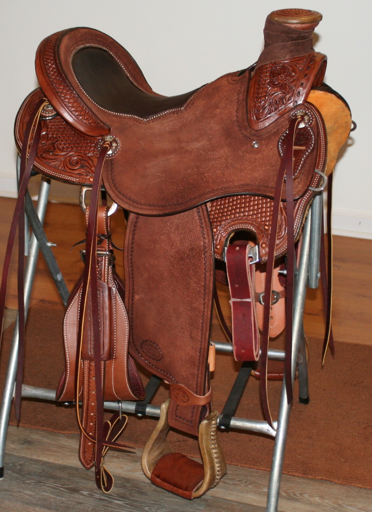 Hermann Oak Tooled Leather Lady Wade Ranch Saddle by Jay’s Custom. 16" Seat, Full Quarter Horse Bars. Dark brown roughout leather skirt and fenders with smooth leather insert in the seat. Rawhide Covered and Laced Bell Stirrups. Back Cinch included. Skirt is 25" from front to back. Lined with 100% Sheepskin Fleece. Saddle weighs 34 lbs as pictured. 615.849.6022 Phone Calls Preferred