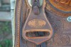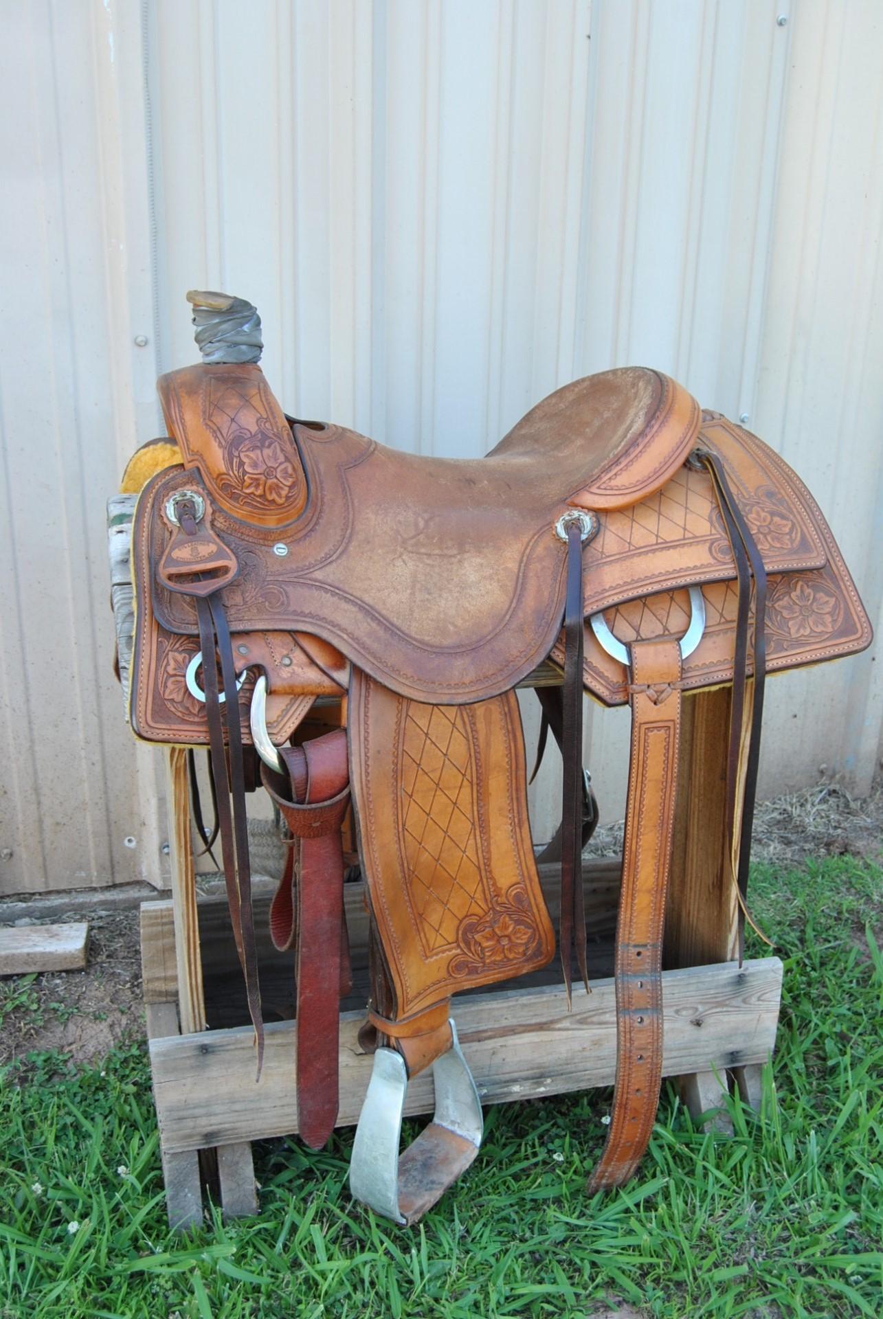 15 ¾’’ Olin Young Roping Saddle By Syl Leather of Stillwater, OK. Saddle is marked SYL LEATHER STILLWATER OK and 01 20 13 004 under the left jockey on the skirt. Saddle features full floral, quilted, and border tooling, rough out seat and jockeys, smooth fenders, swell, rear housing and skirts, saddle strings, floral silver mounted engraved slotted conchos, double D rigging, REAL wool lining, latigo tie straps on both sides for fast/even adjustment, mohair roper cinch, partial tooled back cinch, aluminum slanted stirrups, SS hardware, and is 100% sound. Leather is heavy 13/15 Herman Oak russet skirting and tree is wood with fiberglass and rawhide covered. Tree measures 16’’ (15 ¾’’ finished seat), 6 ¾’’ x 7 ½’’ gullet and 3’’ cantle. All leather is in perfect condition and saddle is ready to go right back on a horse. Located in Stillwater, OK. Price includes shipping to the lower 48 states.