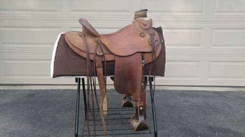 Classic handmade roughout 16" Wade by Bob Severe on a Severe Tree. This is an all-day saddle, very comfortable, and fits a variety of horses remarkably well. Wood post horn, crossover rope strap, long strings, perfect fleece. Thoroughly cleaned and conditioned, sound and solid, ready for whatever you’ve got. Choice of wood or monel stirrups, new 27 strand mohair cinch. Call for details. 502-419-5945.