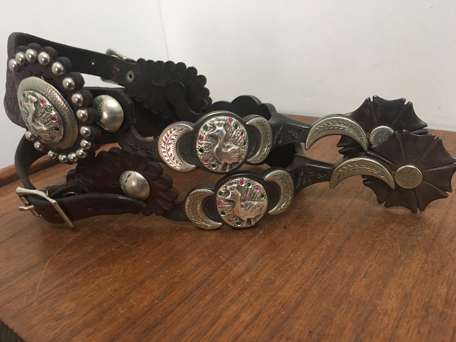 Handmade Bits & Spurs for Sale: JERRY WALLACE DBL MTD SPURS W/FOSTER STRAPS SOLD #61622