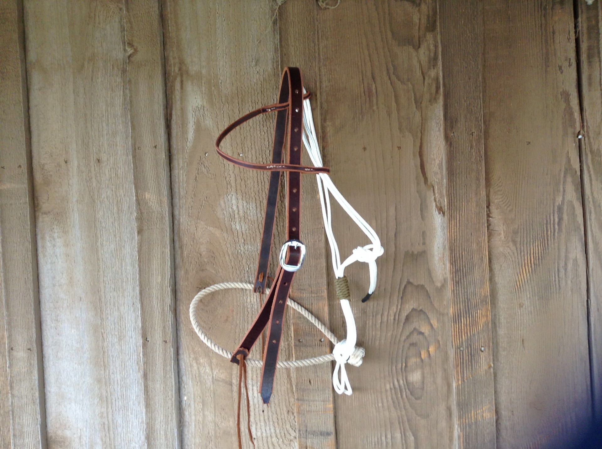7/16 hand tied rope hackamore with hand tied fiadore, leather headstall