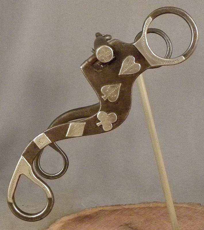 .. SALE PENDING .. Hand made bit by highly sought after Texas maker Tommy Spraberry. 7 1/2" cheek, 5 3/8" three piece mouth with copper wire wrapped center link. Silver card suits and three silver pieces on cheeks. Silver on mouthpiece ends. All hand cut and hand engraved. Marked "SPRABERRY" inside one shank and "NO.30" inside the other. Not bent, broken or repaired. Shows light use. Highly collectable, useable bit by a hard to find maker. $600 shipped priority mail. Call, text or e-mail.