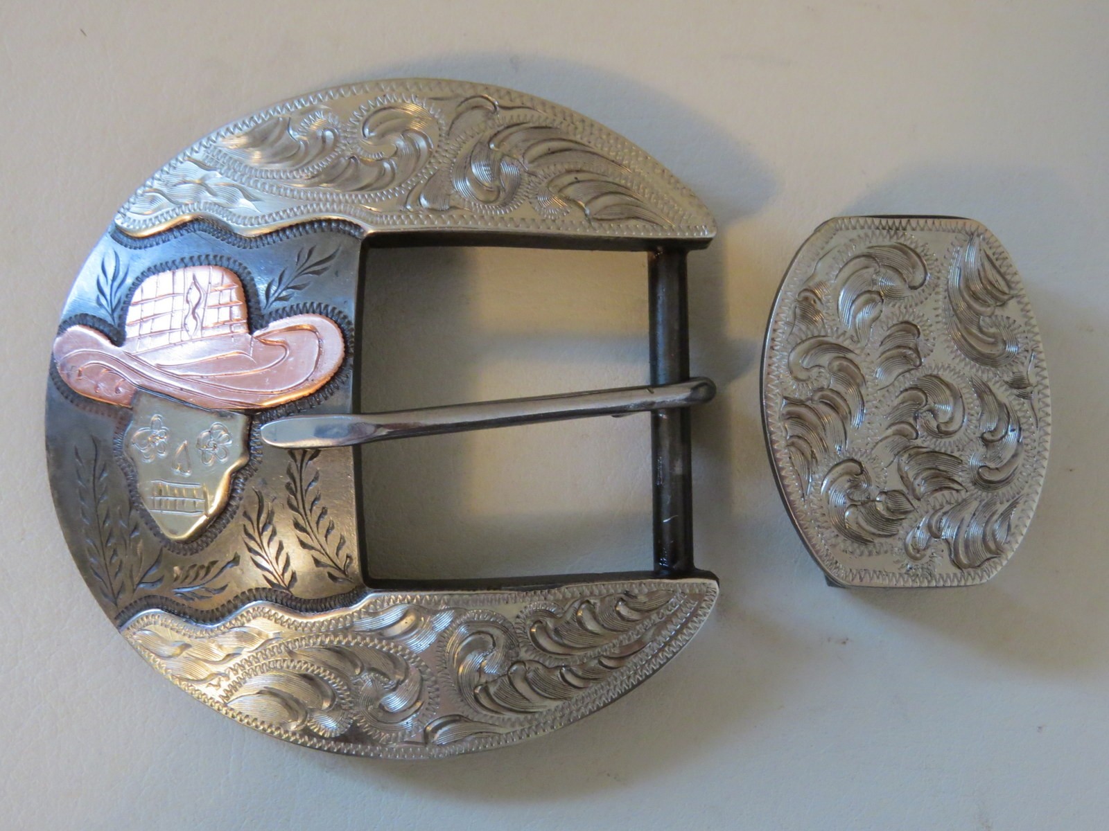 This is a new handmade belt buckle made by Stephen White from Plainview, Texas. Stephen started making spurs and cowboy hardware in 2004 and attended the Weyerts School of Engraving in Alpine, Texas to learn various techniques for overlay and inlaid engraving. Stephen is one of the spur makers selected to provide spurs for the Texas Style Bit and Spur Makers Association Woman’s Protective Services auction along with other top makers. The back of the buckle is marked S. White. The buckle is steel with a dark iron finish and is mounted with nickel silver and copper. There is engraving in the steel around all of the mountings and wheat stalks are engraved in the steel between the mountings. This would be a nice belt buckle to wear.