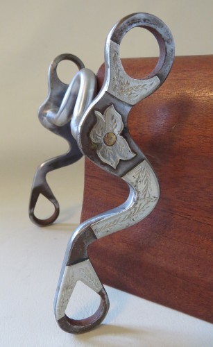 This is a new handmade steel solid shank curb bit marked WT that was mounted by bit and spur maker Stephen White from Plainview, Texas. The bit is steel and is mounted with eight pieces of nickel silver and two pieces of copper. The copper dot in the center of the flowers is set flush with the nickel silver. This would be a nice bit to use.