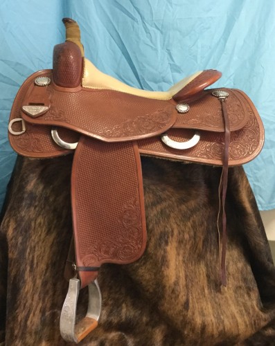 Used Bob’s Custom Bob Avila Cowhorse Saddle, $3000. 16 1/2" tan, doubled padded, glove leather seat, Buster Welsh front, comes with matching silver breast collar, back cinch and billets, long and short fenders, purchased new in 2013, in excellent condition. $3000.