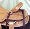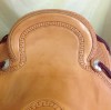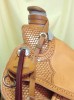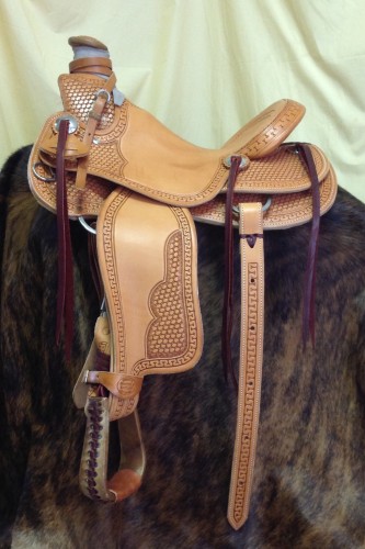 Diamond K Youth Wade Saddle, $1050. 13" hard seat, 6" gullet, 1/2 tooled basket/ smooth out, w/ a running R border, 21" skirts, 6 strings, 2 1/2" mule hide wrapped horn w/ a 3" cap, w/ a rope strap, 2 3/4" Cheyenne roll cantle, 21" skirts, comes with back cinch. Shop built in the USA on a naturally dried rawhide covered hardwood tree. This saddle shows excellent craftsmanship! $1050.