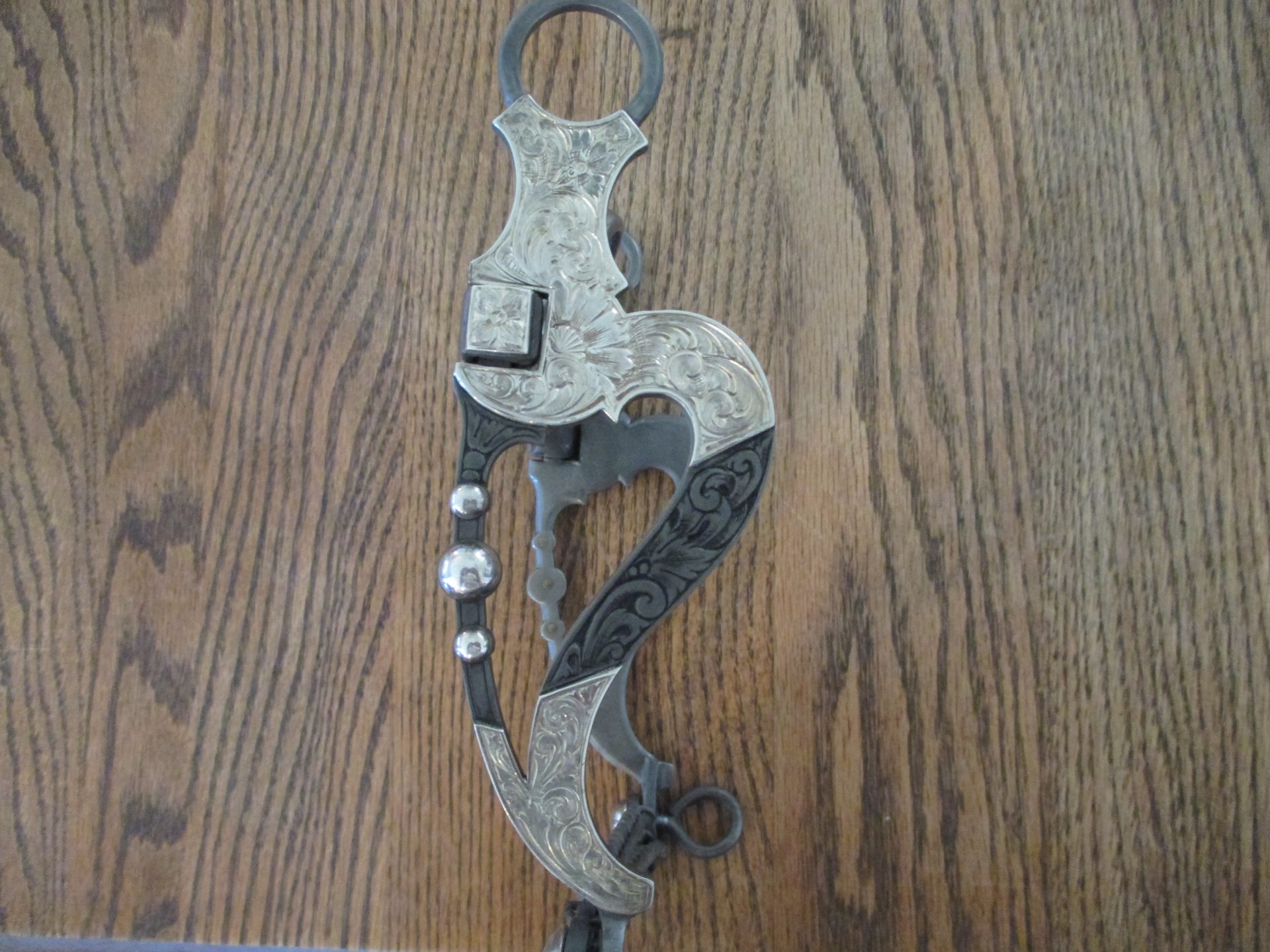 Beautiful Marsh bit. Brand new never has been used. It has a 5" wide mona lisa mouth piece. Has very nice high relief gun style engraving with a nice balance of beautiful bright cut silver engraving. Great for a collection or your tackroom. call Mark with any questions at 541 413 1277