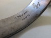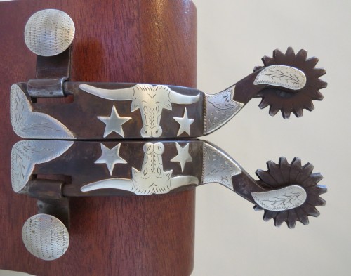 This is a pair of lightly used double mounted handmade spurs made by Texas maker Danny Pollard. Danny is listed in Bits and Spurs, Motifs, Techniques and Modern Makers by Ned and Jody Martin. The spurs are marked D. Pollard, 359, and Anson, TX on the inside of the heel bands. They are mounted with twenty six pieces of nickel silver. The spurs are steel with a browned finish and are mounted with a steer head on the outside band and the four sixes ranch brand on the inside band. This would make a great pair of using spurs or a nice pair to add to a collection.