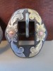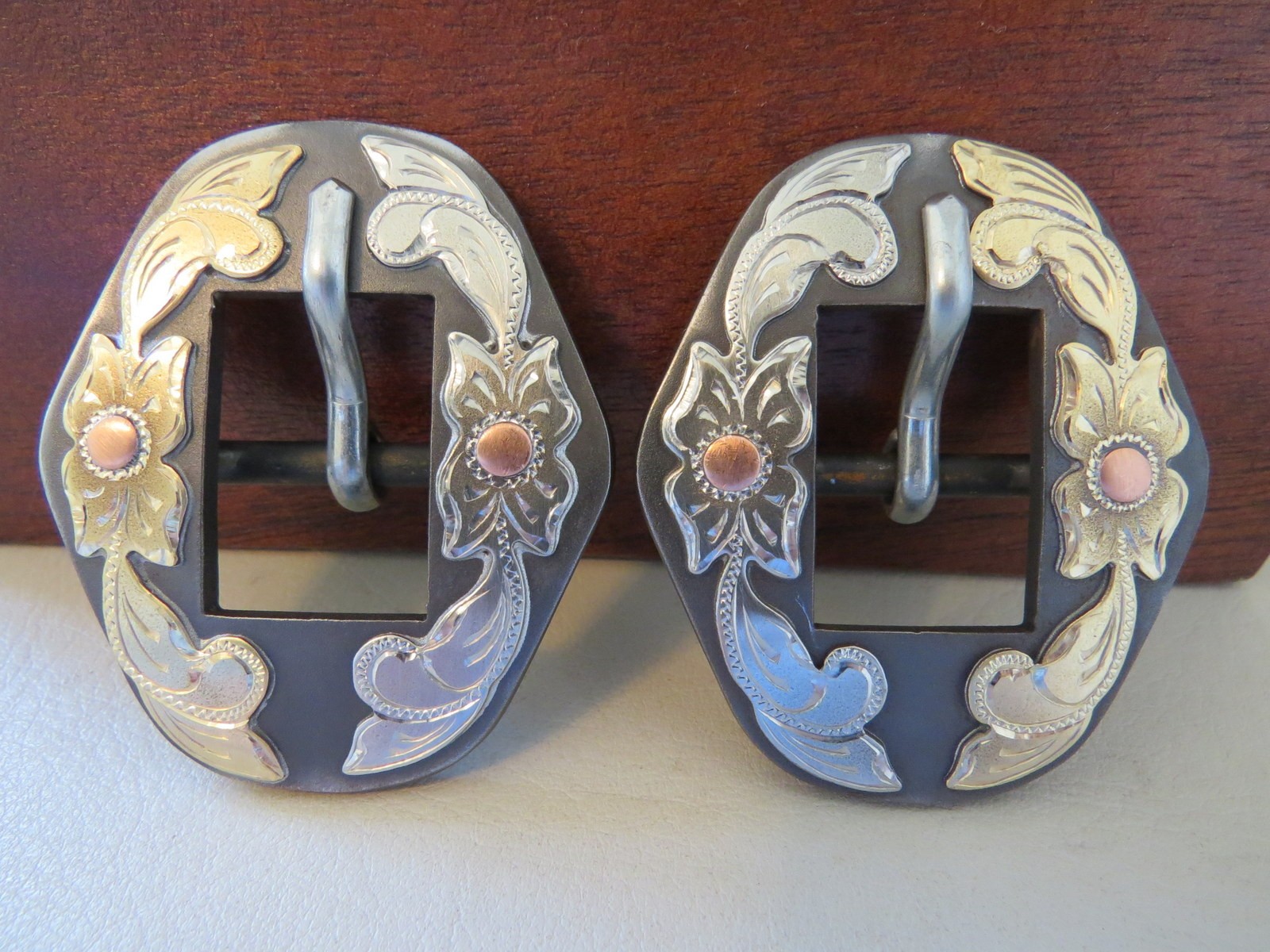 This is a pair of new handmade ⅝” spur strap or headstall buckles made by long time bit and spur maker Don Rogers of Hereford, Texas. Don has been building since 1975 and his work is sought after by cowboys and collectors alike. Don is listed in Bits and Spurs, Motifs, Techniques and Modern Makers by Ned and Jody Martin. The back of the buckles are marked Rogers. The buckles are steel with a gray finish and are mounted with brass, nickel silver, and copper. One side of each buckle has brass flowers and leaves and the other side has nickel silver flowers and leaves. The flowers have copper centers. This would be a great pair of buckles for a pair of spur straps or for a headstall.