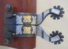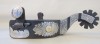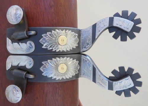 Measurements: Heel Band Width 1 ¼”, Shanks 2 ½”, Rowel Diameter 1 ½”, Rowel Points 10, Heel Opening 3 ⅜”, Weight of Both Spurs 1 pound 12.5 ounces