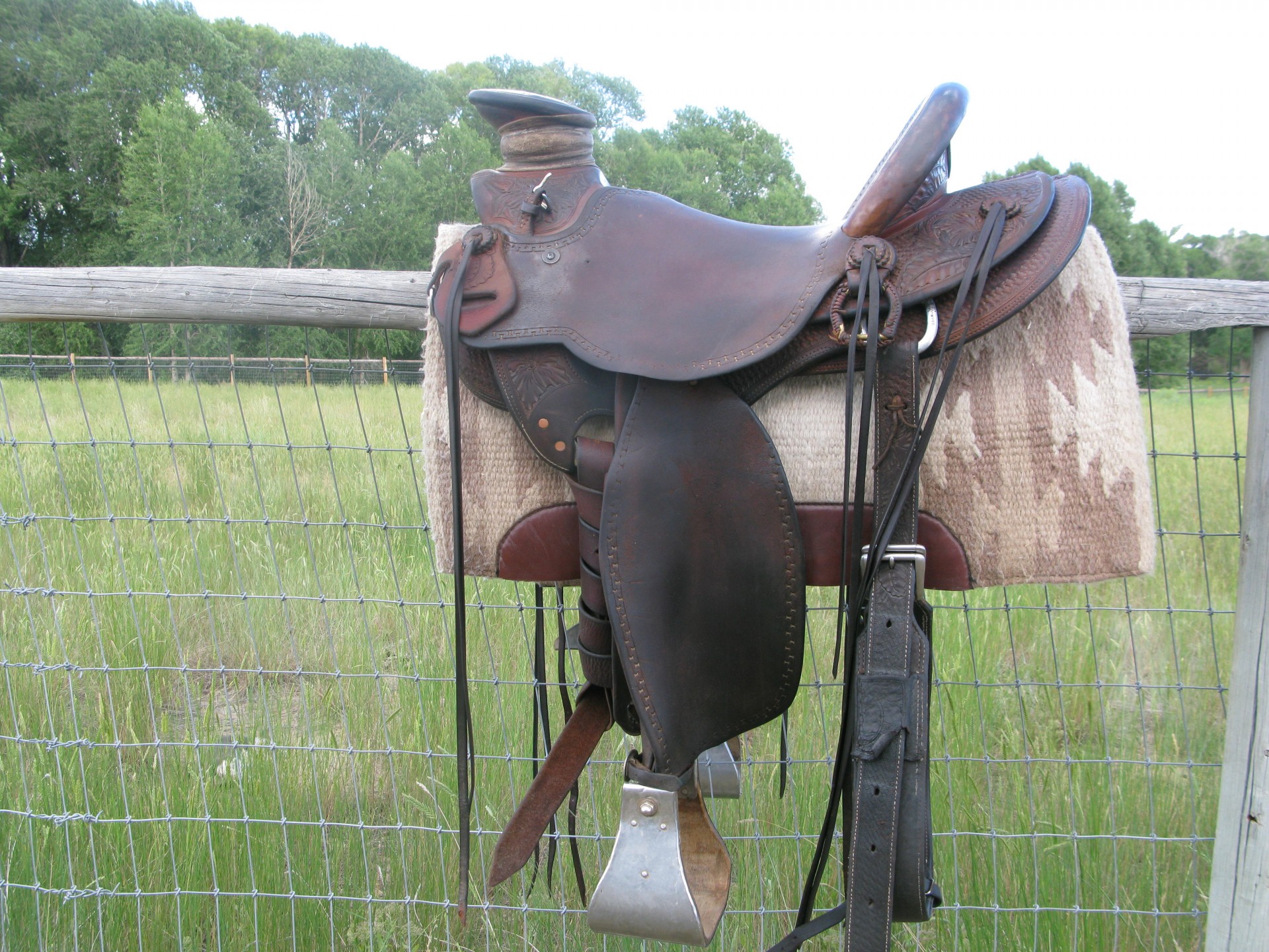 This is a great 15-inch seat saddle made by Kent Frecker himself. It has a 4 ½ in cantle, a 5 ½ in horn, and the sheep skin is in great condition. This is a great, comfortable saddle to ride all day and is fun to rope in as well. It is well used, and some of the holes in the fenders are a little wallowed out, and the back cinch keepers have a little stitching coming out. I also think that one of the latigo keepers has been replaced. That said, this saddle still has lots of life left. I have never had this saddle sore a horse, and have had it on about every shape you can think of. This has been a great saddle for me and I still love riding it, but I have a new custom one on the way that I have to pay for. Please contact me with any questions, and if you need more or different pictures, don’t hesitate to call. Reasonable offers will be considered.
