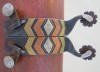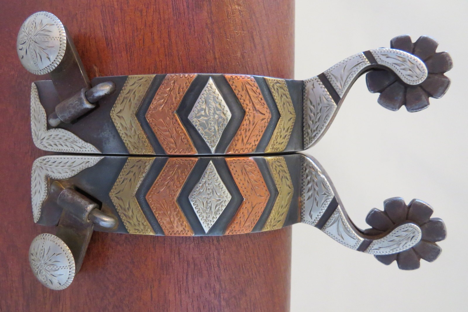 This is a pair of lightly used handmade spurs made by well-known bit and spur maker Ronnie Jones from Enid, Oklahoma. Ronnie’s work is illustrated in Bits & Spurs Motifs, Techniques and Modern Makers by Ned & Jody Martin. Ronnie builds Texas style bits, spurs, cowboy hardware, and jewelry and likes to use a combination of silver, copper, and bronze. The spurs are marked with his maker mark. The spurs are steel with a dark iron finish and are mounted with thirty four pieces of metal (eighteen nickel silver, eight brass, and eight copper). This would be a nice pair of spurs to wear.