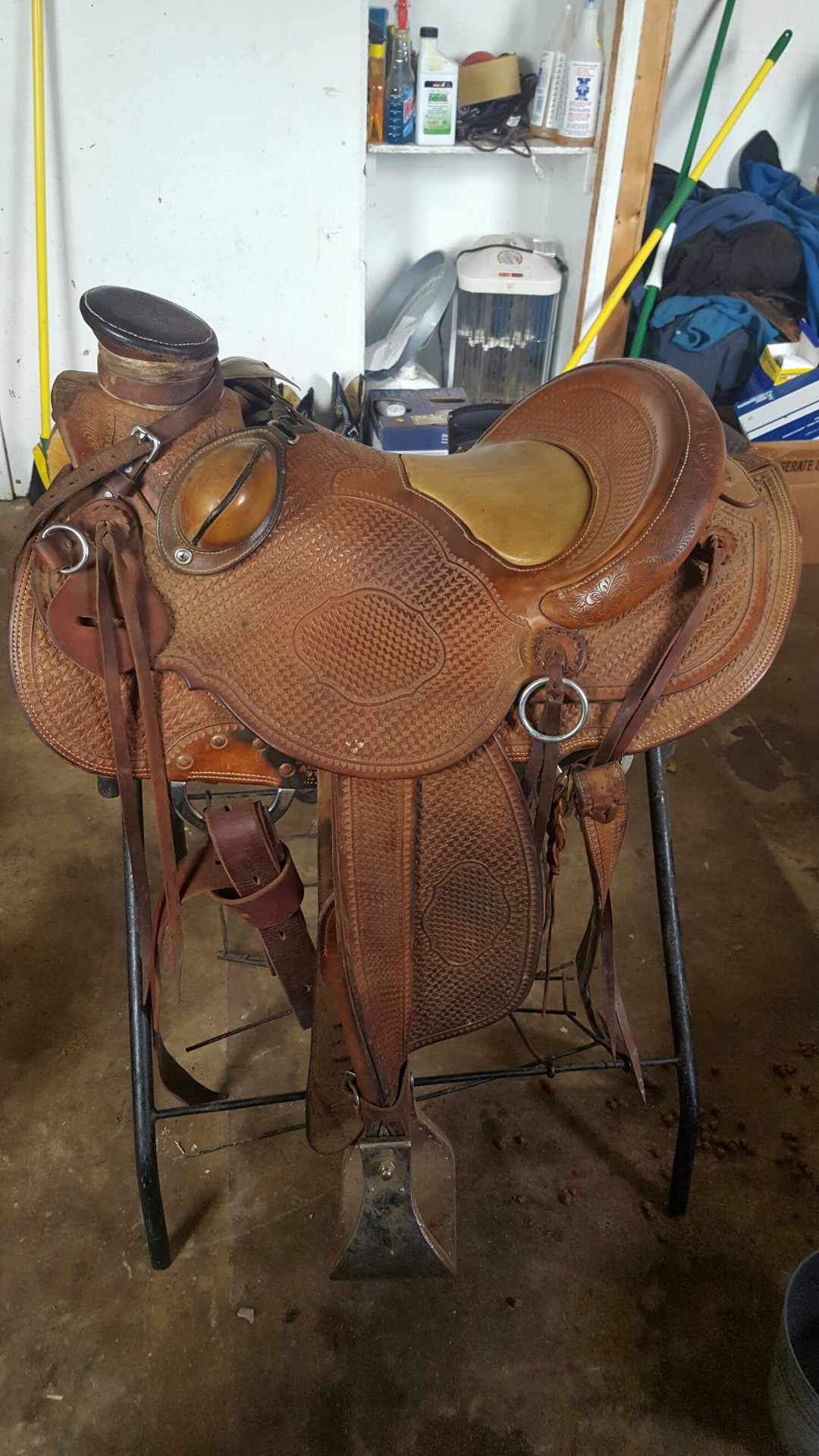 Made by Jesse Smith out of Colorado. This is a beautiful saddle that fits a horse beautifully, is great to rope out of and is very comfortable. 16" seat, 2" horn, 4 1/4 horn cap, 3 1/2" cantle. This saddle fits every horse I put it on