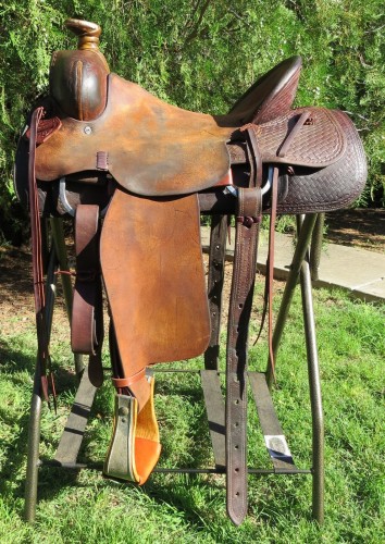 This is a used handmade cowboy saddle made by the legendary saddle maker Bob Marrs from Amarillo, Texas. Bob has been featured in many publications including Old Cowboy Saddles & Spurs by Gretchen and Mike Graham. There was also an article about him in the March 2010 issue of Western Horseman. It is marked Bob Marrs, Maker, Amarillo, Texas and numbered 3884. The saddle has a rough out seat and fenders, basket stamped skirts and cantle, and swells. The horn is wrapped with rawhide. There is a rope burn under the rawhide wrap but it will be fine with the new wrap. It has a Will James rawhide covered wood tree and the tree is sound. It is lined with real sheep skin. The saddle has new stirrup leathers, new D hobbles, new stirrup leather hobbles, new latigo keepers, and new treads on the 3” bell stirrups. The saddle shows normal signs of use. There is a repair on the edge of the left seat jockey shown in the close up pictures. It does not come with a front or back cinch. The saddle has been thoroughly cleaned and conditioned. This is a quality well-built saddle from a legendary maker and it has a lot of use left in it.