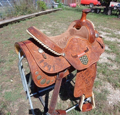 gorgeous Jim Taylor 15.5" award saddle...1991 Team Roping Texas Champion...full quarter horse bars....never ridden - has shuffled around a few tack rooms since 1991 and then sitting in a family den, indoors. The grandkids liked to climb off and on and play cowboy.