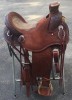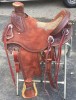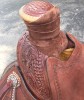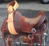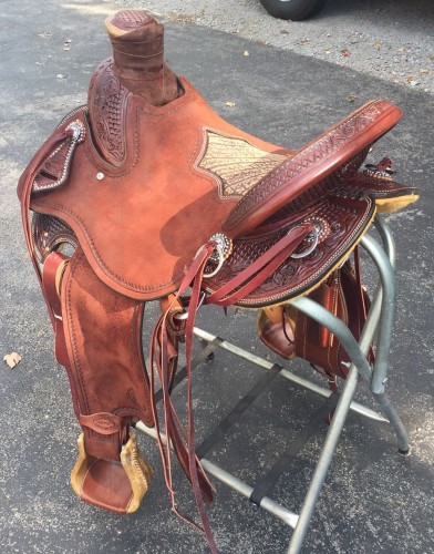 Roughout leather seat, jockey and fenders with smooth leather insert in the seat. In-skirt double rigging with matching flank cinch. Rawhide covered deep stirrups. Skirt is 26.5" from front to back. 100% wool fleece lining. Weighs 38 lbs as pictured.