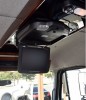 Wood floor console between front captain’s chairs with tooled leather inserts